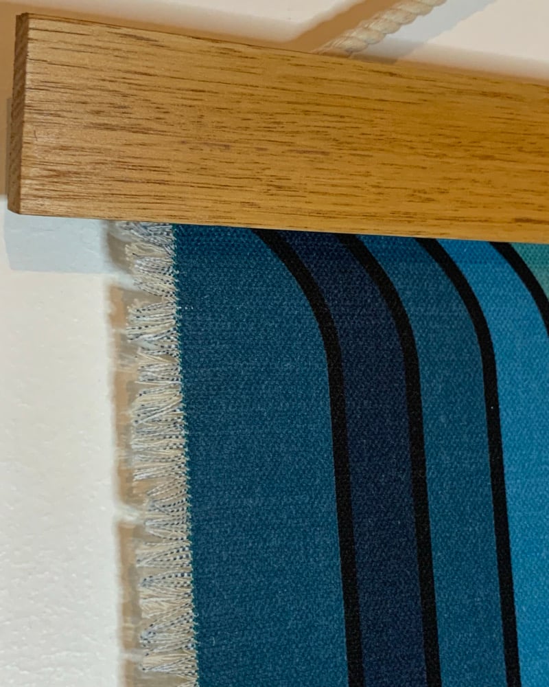 It features an unbleached cotton backing which has been fused on to create a nice heavy weight smooth finish to the hanging, teak stained batons & cotton rope to hang.