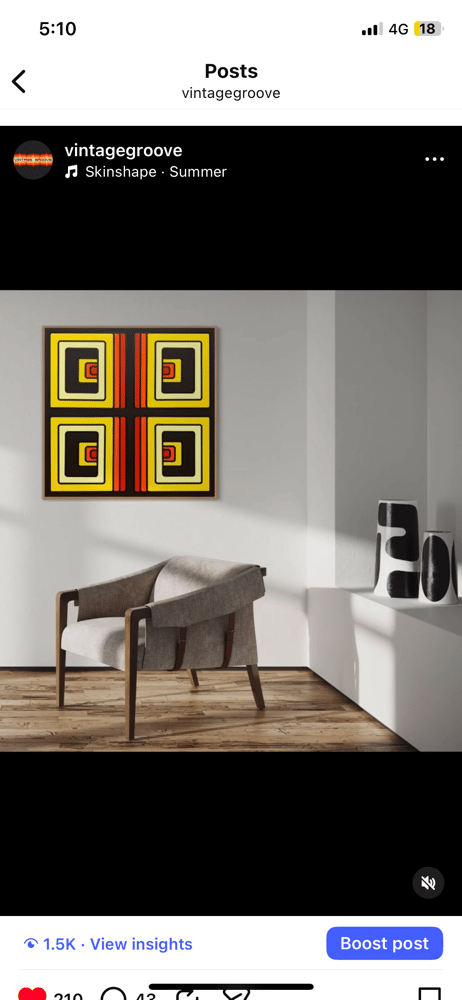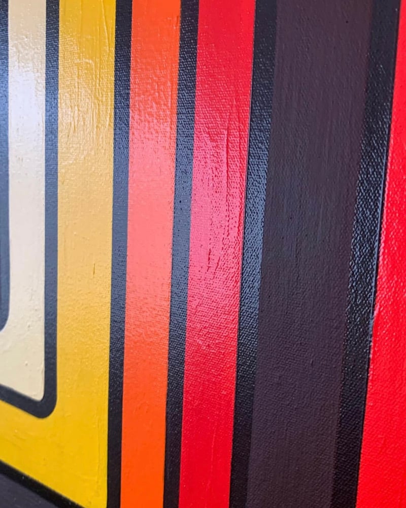 This hardedge work makes use of geometric shapes & an op art style to convey an imagined view of a time warp.